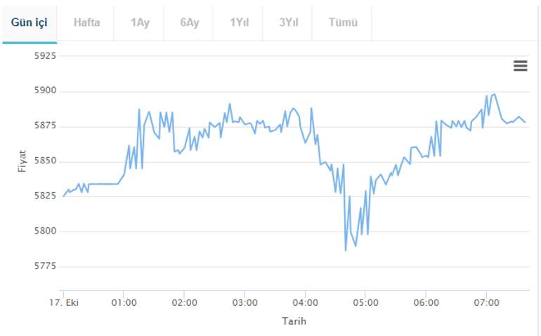 Sabah saatlerinde 5.770 TL seviyesin güne başlayan gram altın, şu dakikalarda 5900 TL seviyesinde dalgalanıyor.