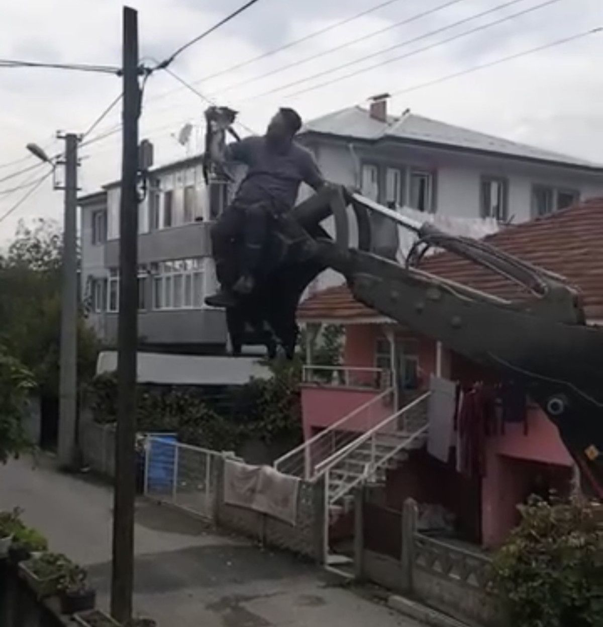 Ekipler, kepçeyi direğe yaklaştırdı ancak kediyi aşağı indiremediler. Bunun üzerine bir personel, kepçenin kovasına binerek direğe çıkarak kediye ulaştı.